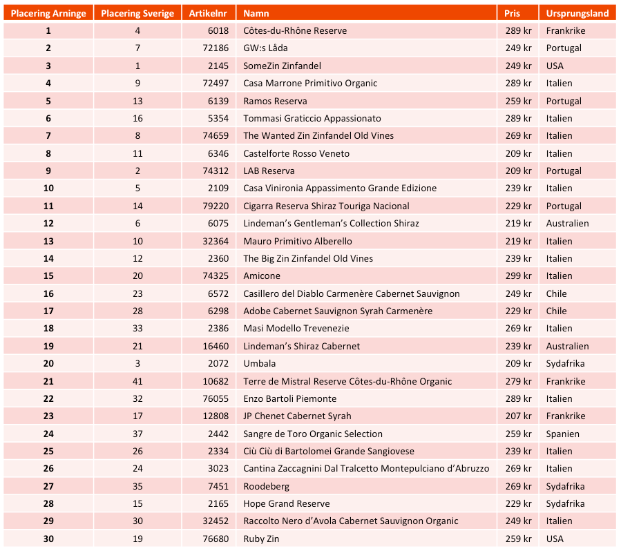 Några skillnader när Arninge-butiken jämförs med topplistan för hela Sverige, är att de lägre prisade LAB Reserva och Umbala är mindre populära i Arninge, medan exempelvis GW:s Låda, Ramos Reserva, Adobe och Masi Modello säljer relativt sett något bättre. Nylanseringen från i höstas Enzo Bartoli Piemonte har fått en av många LES-butiker i Arninge och ligger redan på position 22. Även de högre prisade Terre de Mistral och Amicone är mer lokalt populära i Täby-butiken. Andra skillnader på topp 30-listan ser du i diagrammet ovan (Vintoppen för Arninge sträcker sig ända till Foot of Africa Shiraz på sista positionen, men av layoutskäl så begränsar vi den i bilden här).